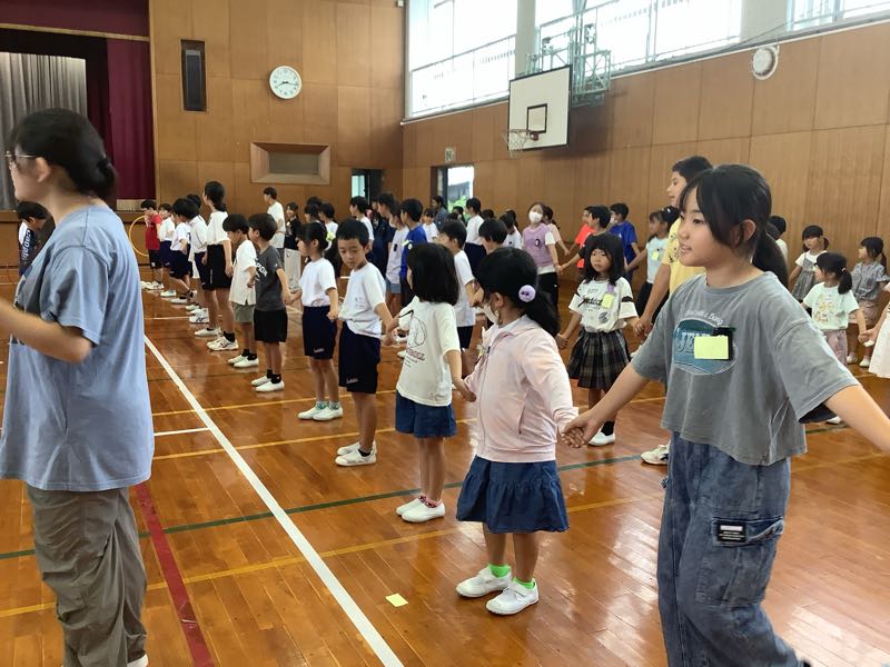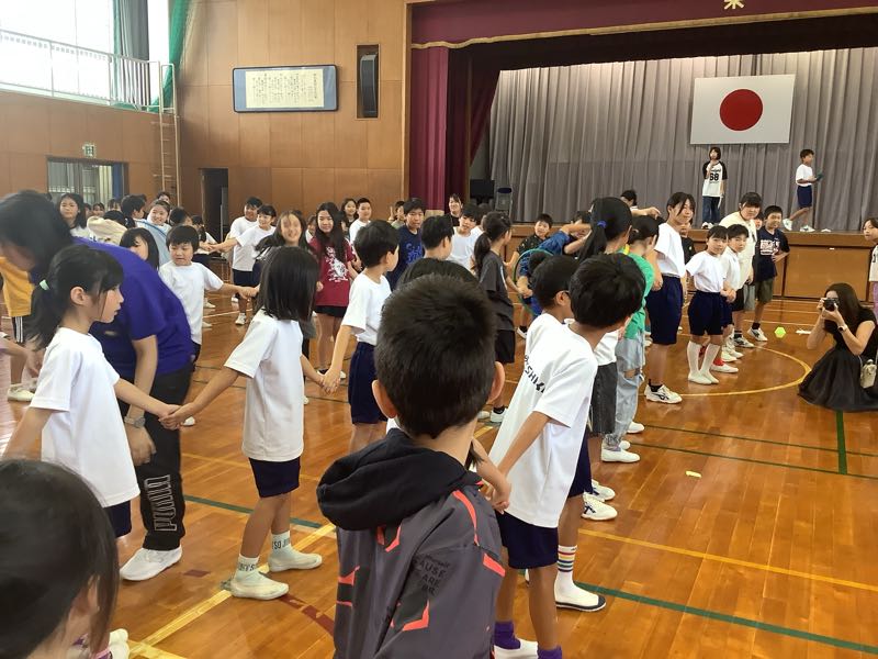 全校を15のチームに分けてフラフープリレーを行いました。1年生から6年生まで一緒になってフラフープをくぐりました。