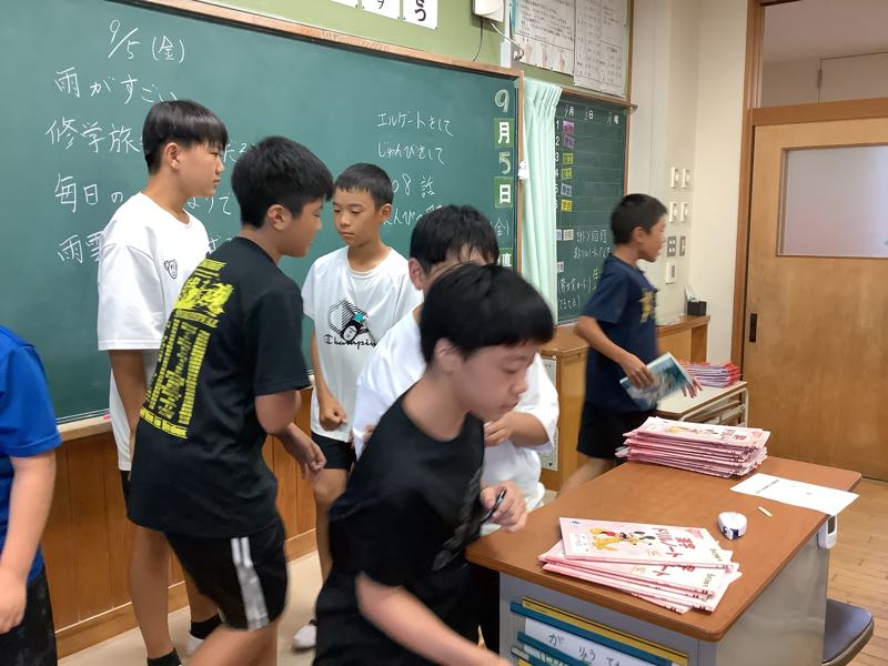 始業式では、3人の子が代表で2学期にがんばりたいことを発表しました。校長先生からは、2学期は1年で一番長い学期であり、いろんな行事や学校生活でみんなで協力して感動できる場にしてほしいとお話がありました。夏休み中に大会が行われた自転車部の表彰伝達が行われました。