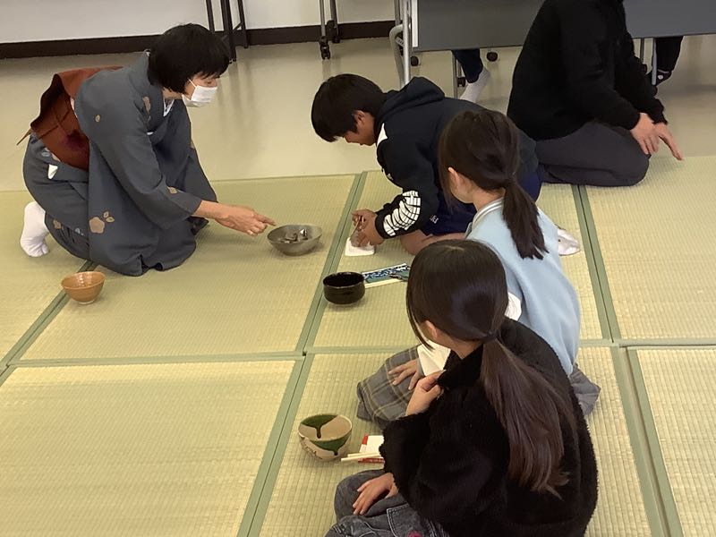 茶道クラブでは、お菓子をいただきながら礼儀作法を学んでいました。深々とお辞儀をしています。