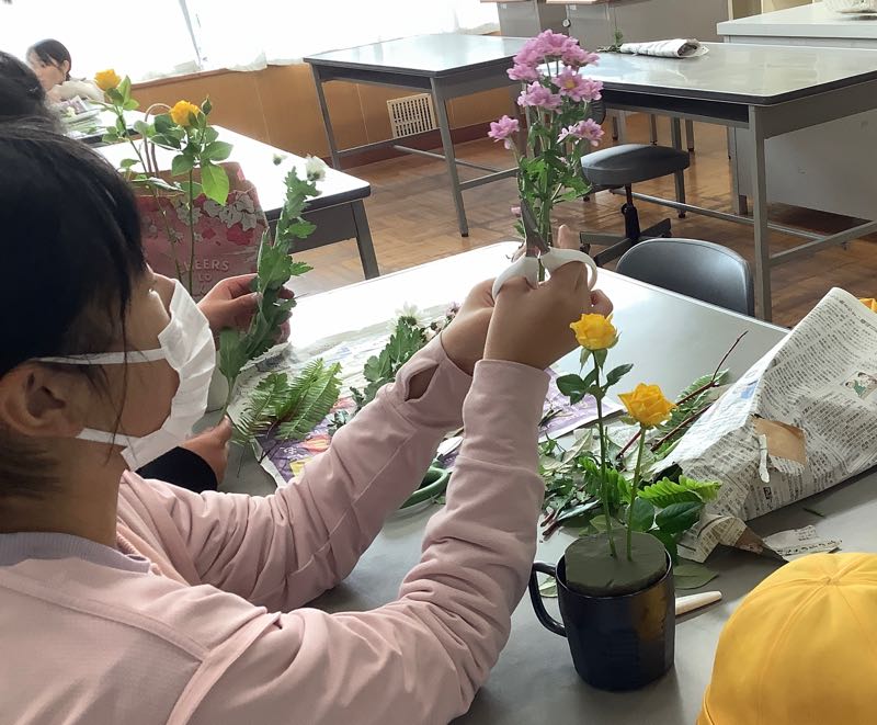華道クラブでは、コップにお花を生けていました。個々のセンスが光りますね。
