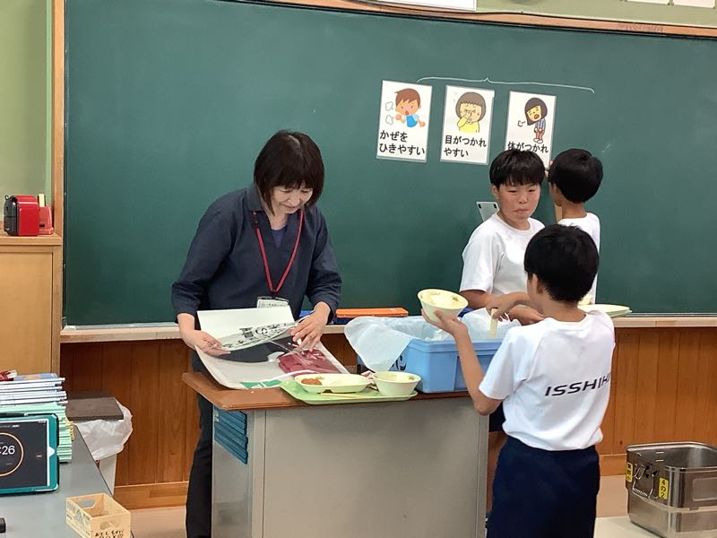 4年2組で栄養教諭の池田先生による給食指導がありました。