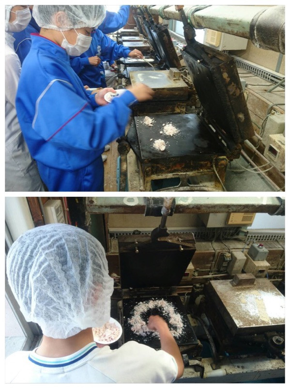 6組は、山伍さんで、えびせんべいを焼く体験中。各々オリジナルの形に挑戦しています。