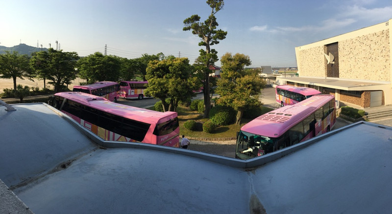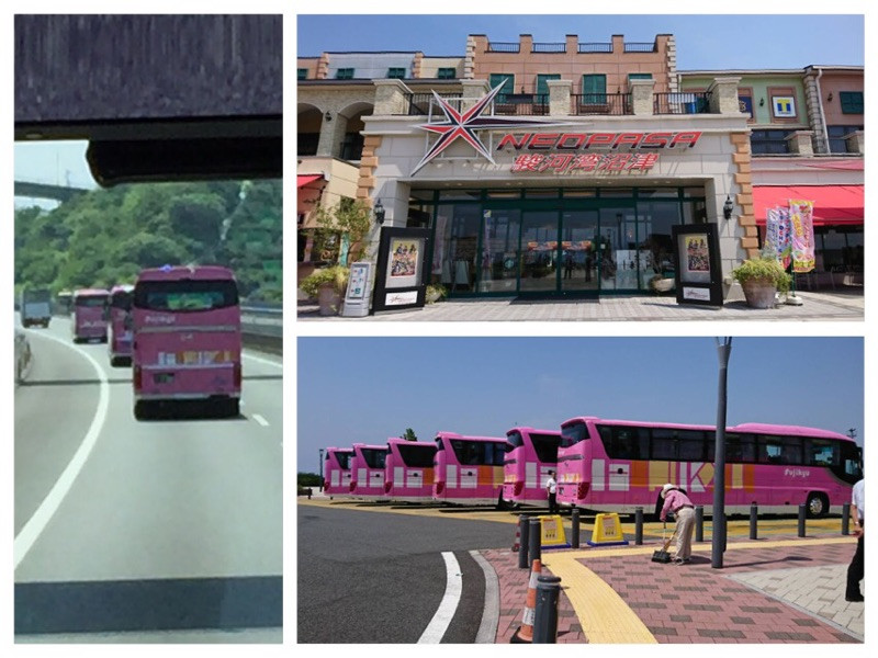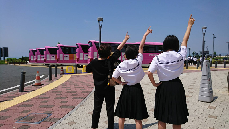ピンクの可愛いバスの集団は、駿河湾沼津に到着しました。