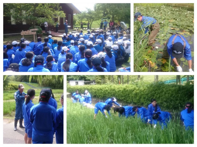 西尾いきものふれあいの里で、草取りボランティア活動が行われました。吉良中からは約40人が参加しました。女子は花菖蒲の周りの草取り、男子は沼に入って葦を刈り取る作業をしました。