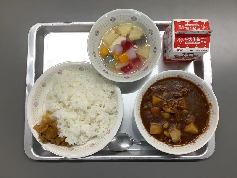 ごはん、牛乳、ポークハヤシ、福神漬け、ゼリーミックスです。