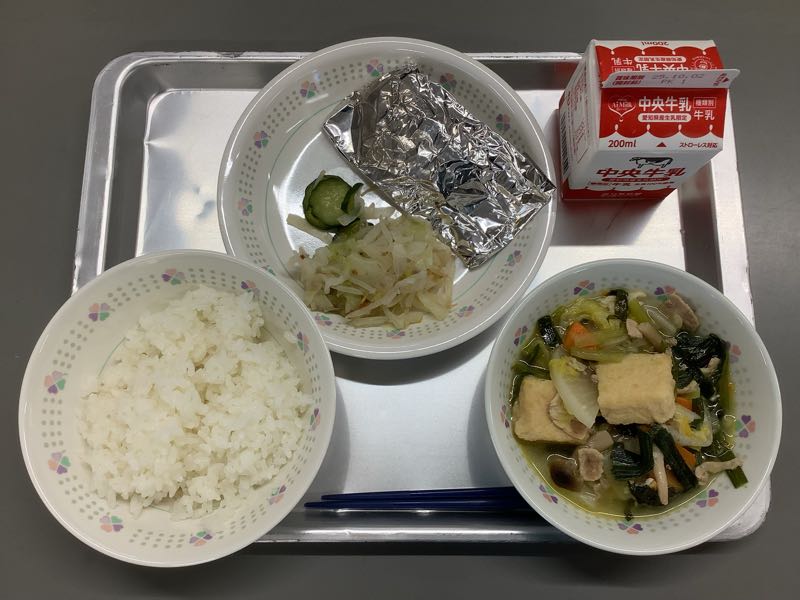 ごはん、牛乳、さばの銀紙焼き、きゅうりともやしの梅あえ、豚塩ちゃんこ煮です。