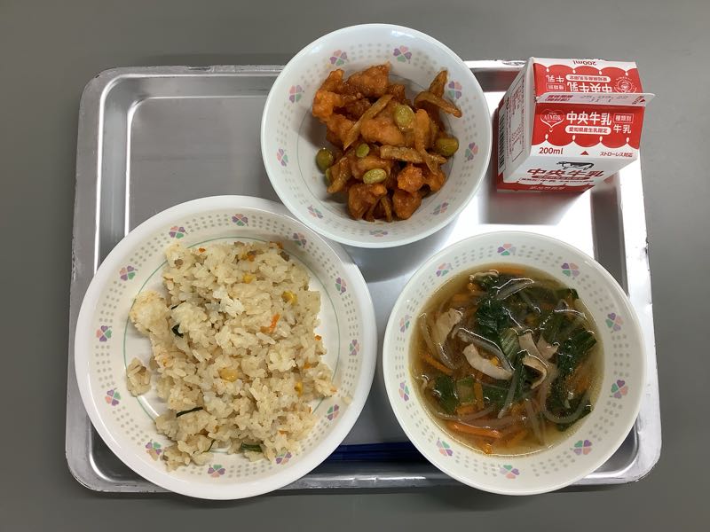 チャーハン、牛乳、鶏肉ごぼうのチリソース、春雨スープです。