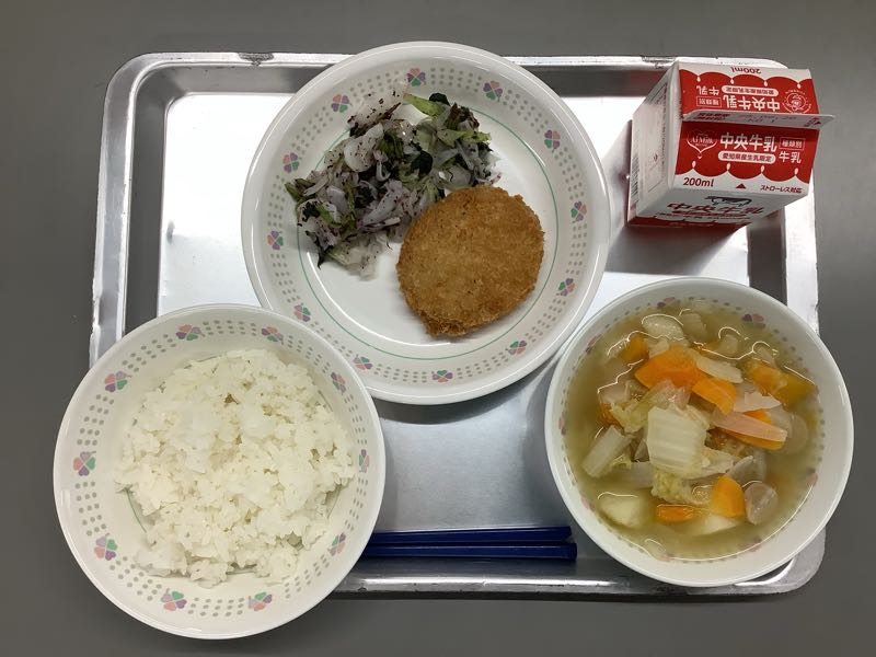 ごはん、牛乳、メンチカツ、キャベツの赤しそあえ、和風ポトフです。