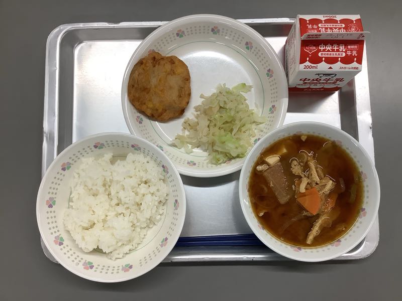 ごはん、牛乳、手作りさつま揚げ、たくあんあえ、豚汁です。