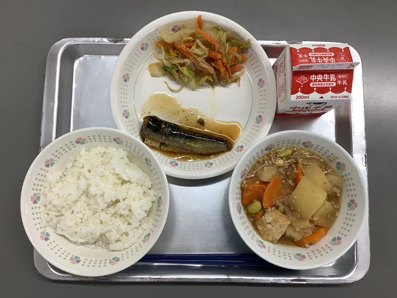 ごはん、牛乳、いわしのしょうが煮、はくさいのごまあえ、じゃがいものそぼろ煮です。