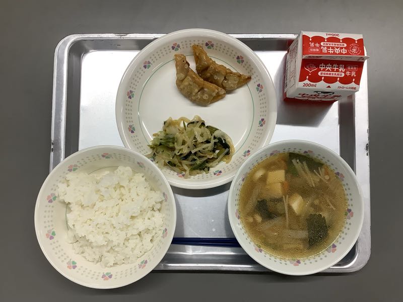ごはん、牛乳、揚げぎょうざ、もやしのナムル、わかめスープです。