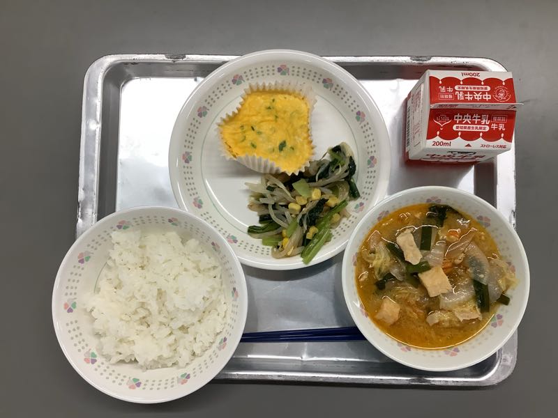 ごはん、牛乳、中華風卵焼き、小松菜ナムル、キムチスープです。