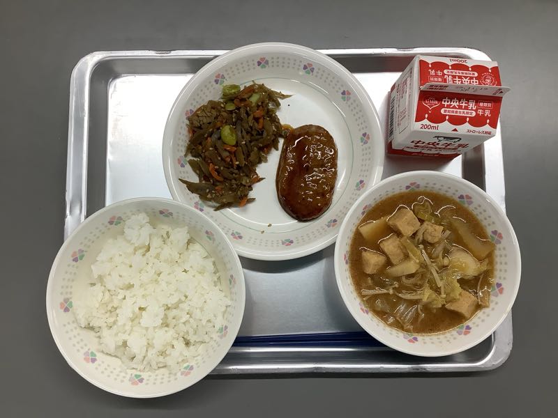 ごはん、牛乳、照り焼きハンバーグ、五目きんぴら、里芋と生揚げのみそ汁です。