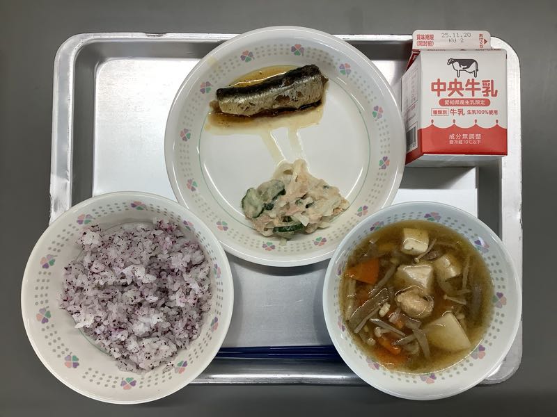 赤しそごはん、牛乳、イワシのしょうが煮、だいこんサラダです。