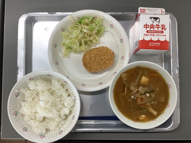 ごはん、牛乳、さつまいもコロッケ、たくあんあえ、豚汁です。