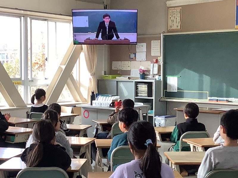 次に、校長先生からお話がありました。子どもたちは教室のテレビを観ながら真剣に話を聞きました。