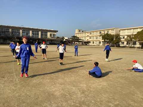 体育の授業で、縄跳びリレー大会を開催しました。5チームに分かれ、前跳びの部と後ろ跳びの部で行いました。チームのために跳んだり応援したりしながら楽しく行うことができました。