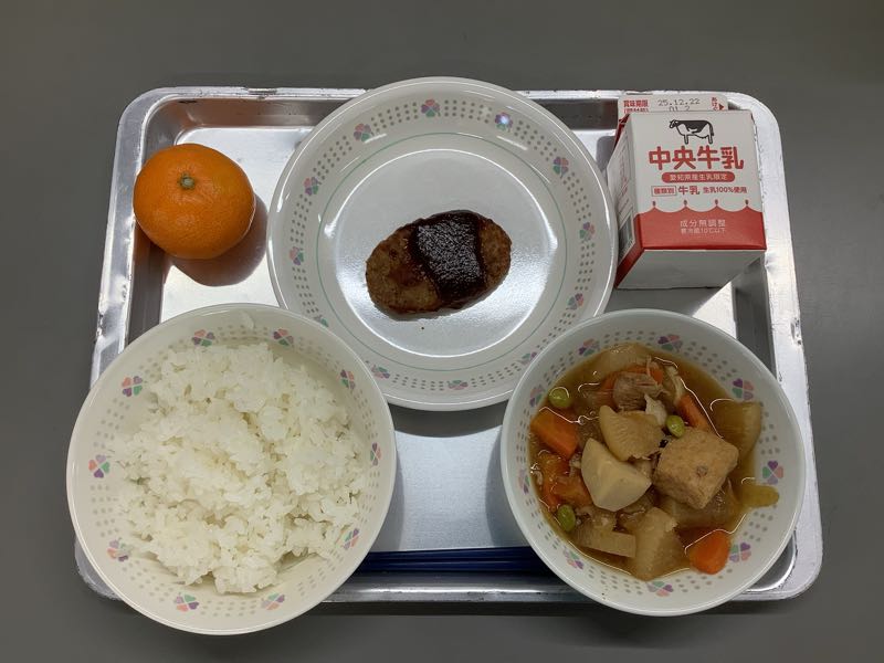 ごはん、和風みそハンバーグ、豚肉とだいこんの煮物、みかんです。今日の煮物に使われているだいこんは、2年生が大事に育ててくれただいこんです。味が染み込んだおいしい煮物ができました。