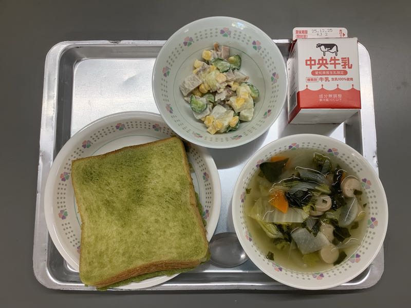 抹茶トースト、牛乳、おいもサラダ、野菜スープです。