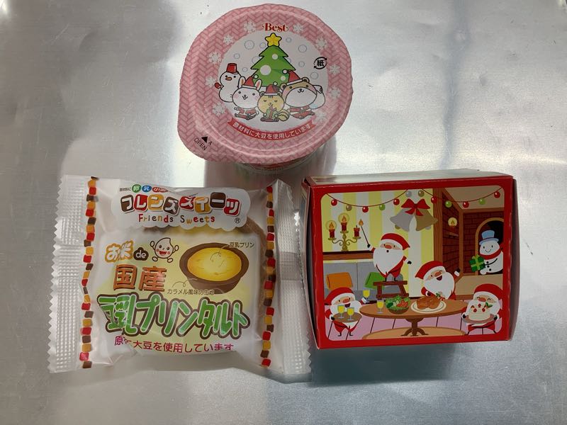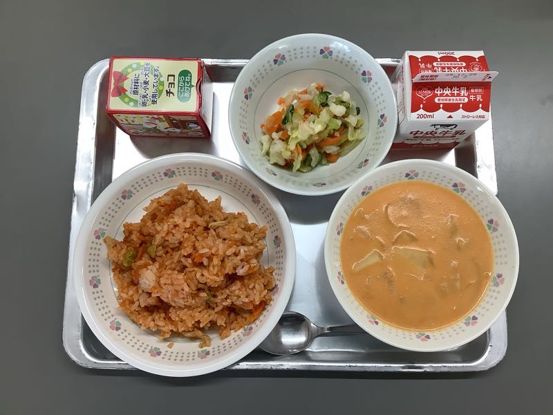 チキンライス、牛乳、キャロットポタージュ、イタリアンサラダ、セレクトデザートです。セレクトデザートは、いちごプリン、チョコケーキ、豆乳プリンタルトの3種類から好きなものを選びました。