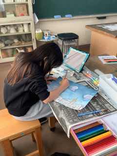 図工の授業で、あったらいい町を想像して描きました。