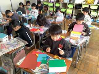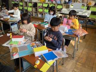 図工の授業で、組み立てた箱に飾り付けをしています。何を入れようかな、とみんなわくわくしながら作っています。