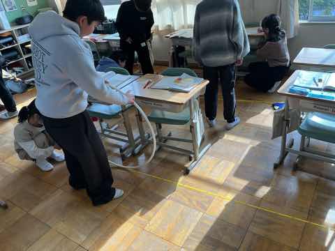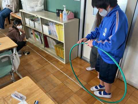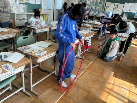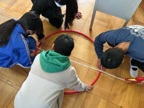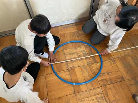 算数科「円と正多角形」の授業で、直径と円周の関係を調べる授業を行いました。フラフープを使って、グループで協力しながら長さを測って関係を調べることができました。