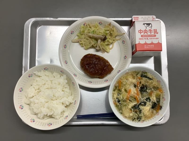 ごはん、牛乳、和風おろしハンバーグ、しめじのマヨポンあえ、かきたま汁です。