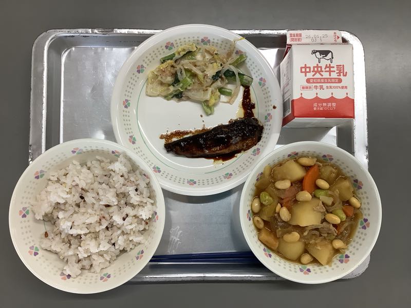 五穀ごはん、牛乳、いわしの八丁味噌煮、小松菜の和風サラダ、豆じゃがです。今日の煮物に使われている大豆は、石川農事様から寄贈していただいた大豆です。地元の食材をおいしくいただきました。