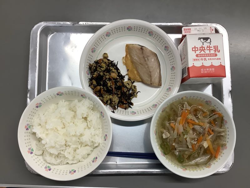ごはん、牛乳、サバの塩焼き、ひじきと卵が出会った日、沢煮わんです。今日のひじき料理は、6年生が考えた献立です。