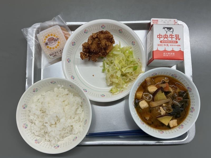 ごはん、牛乳、塩麹から揚げ、たくあんあえ、さつまいものみそ汁、焼きプリンタルトです。
