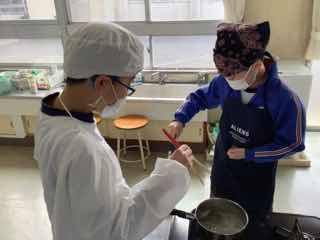 家庭科の調理実習でみそ汁を作りました。班ごとに具材を考え、おいしいみそ汁ができました。