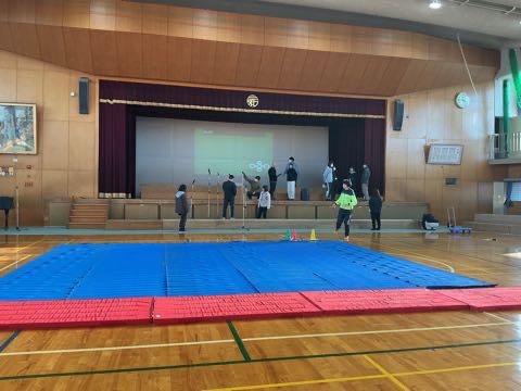 カーペットや台、プロジェクター、マイクなどを手際よくセットしていきます。