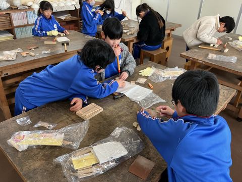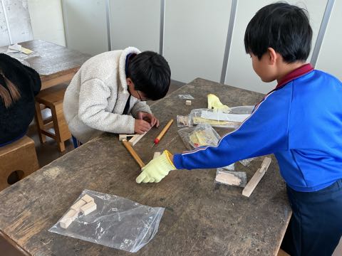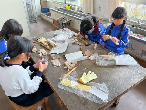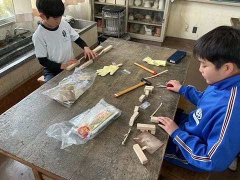 図工の学習で、のこぎりやげんのうを使い、それぞれが作りたいものを考えながら、一生懸命作品づくりを進めています。形もだいぶできてきて、どの作品もとても素敵です。完成が楽しみです。