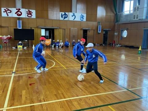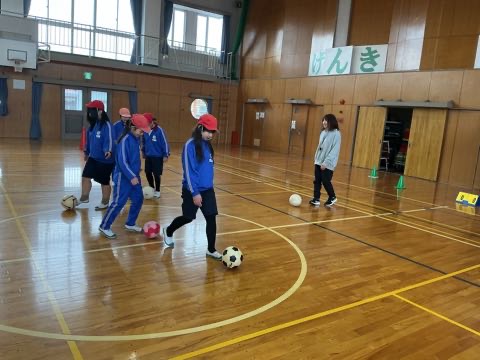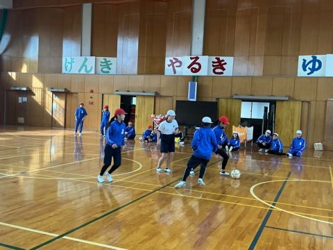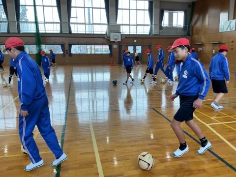 体育でフットサルが始まりました。ドリブル練習や2対2の試合をやりました。