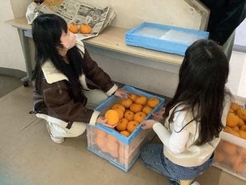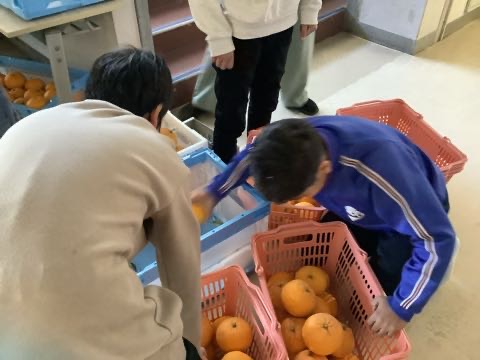 飼育栽培委員が校長室南のみかんを収穫しました。