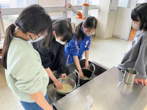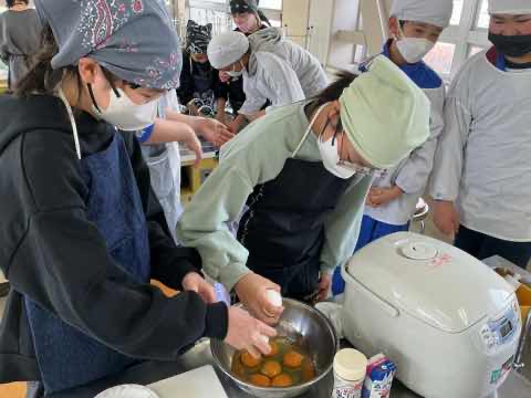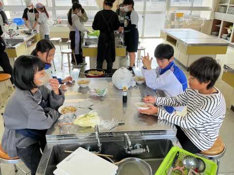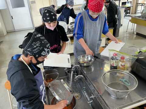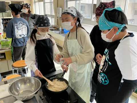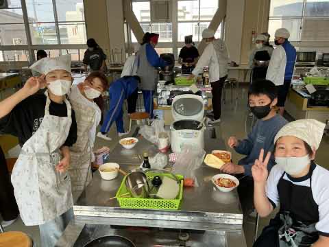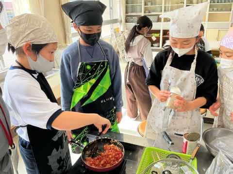 5年生が1年間かけて育ててきたお米を生かした料理を考え、調理しました。冬休みの宿題で考えたレシピを班で練り直し、役割分担をしながら作ることができました。どの班も愛情のこもった美味しい料理を作り、笑顔で完食しました。
