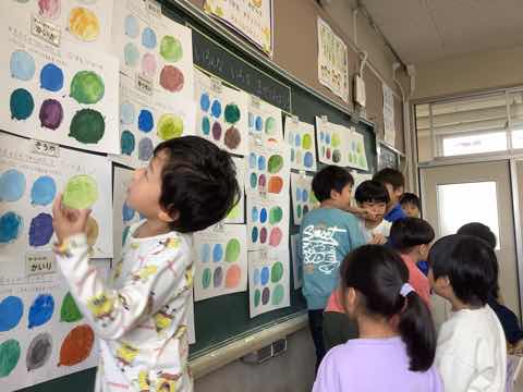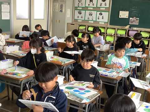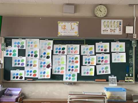 図工の授業では、絵の具を使って混色に挑戦しています。