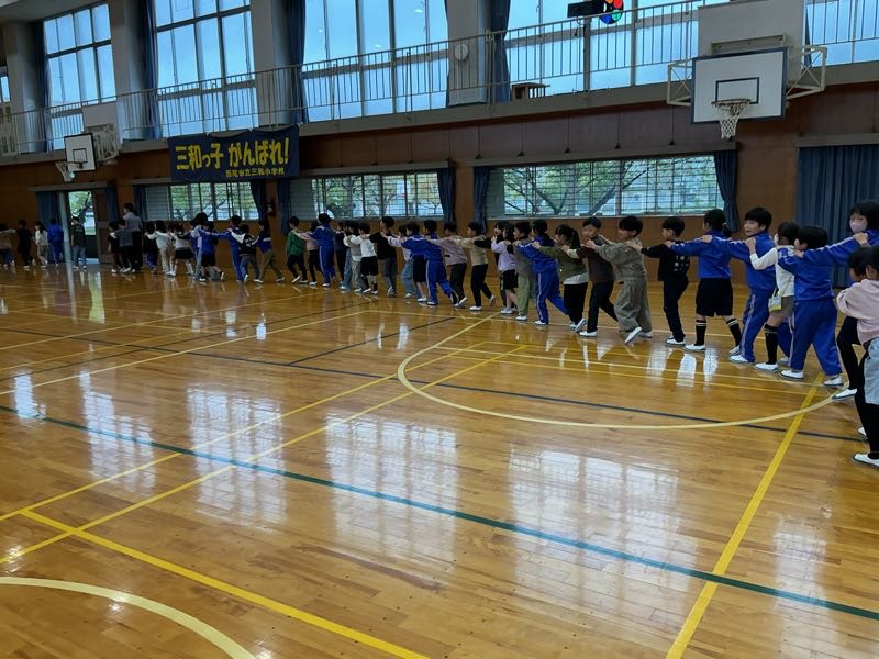 後半には「じゃんけん列車」を行いました。最初は少し遠慮がちだった子も、だんだんと笑顔が増え、「やった!勝った!」「つながったよ!」と楽しそうな声が広がりました。最後には長い長い列車ができ、学年みんなが一つにつながることができました。