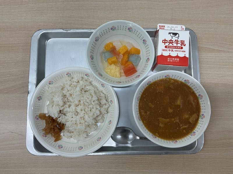 麦ごはん、牛乳、ポークカレー、福神漬け、フルーツポンチです。