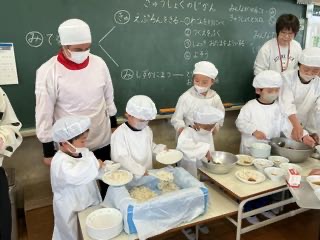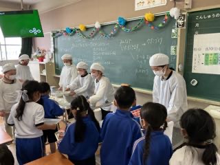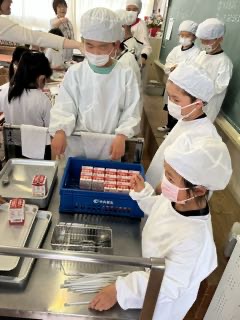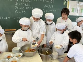 小学校に入学して初めての給食です。献立はカレーライスとフルーツポンチです。給食当番もがんばりました。6年生のお兄さんやお姉さんも手伝ってくれました。おいしくいただきます。