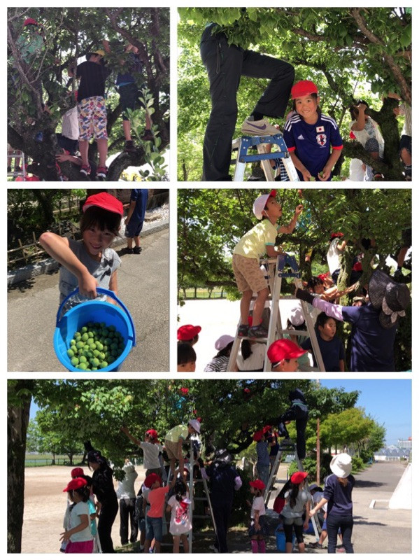 東昇降口前で梅の実を採りました。生活科の勉強です。