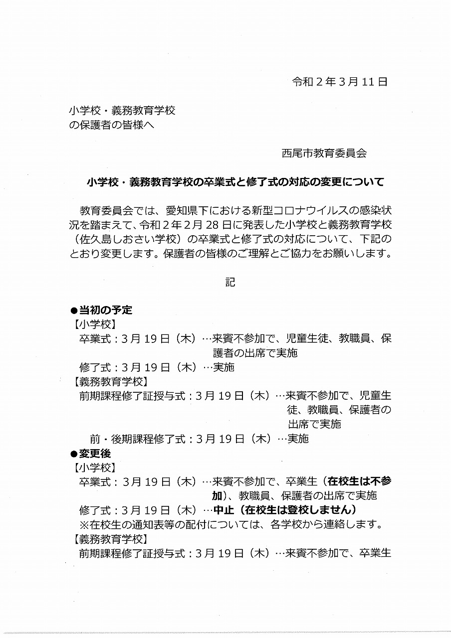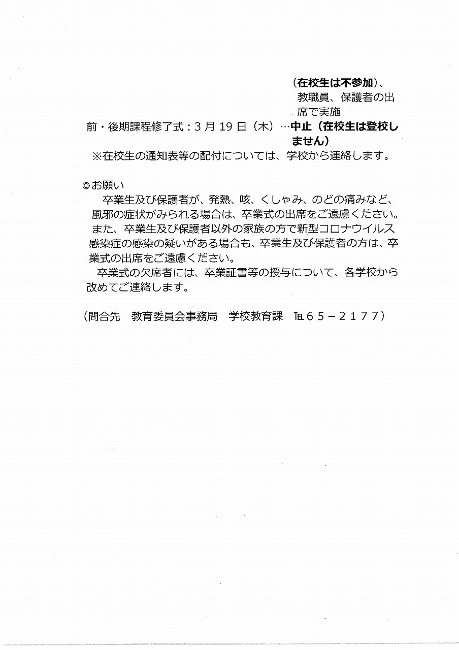 室場小学校につきましては、通常通りの時刻に、新2~6年生で集団登校をしてください。下校時刻については、式の内容を検討して後日メール配信をさせていただきます。なお、児童に発熱や風邪症状がある場合には、登校(出席)を控えてください。その際は、室場小学校までご連絡ください。保護者の皆様のご理解とご協力をお願いします。