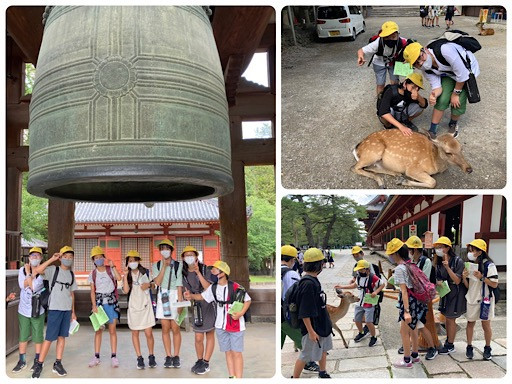 大きな鐘の下をくぐって、鹿と戯れながら移動中です。