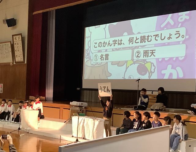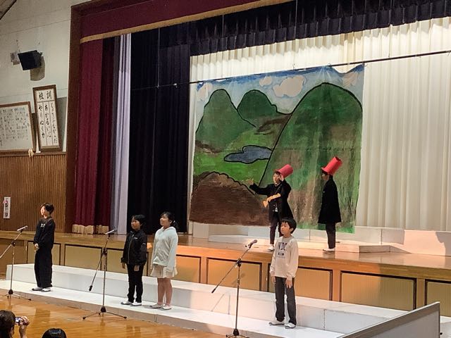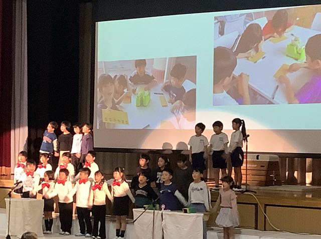 発表順に、まず、2年「みんなでチャレンジ!室場クイズショー」。クイズ番組に出ている人になりきって、台詞も動きもがんばりました。大きくはっきりとした声で、テンポよく、みんなで盛り上げながらクイズが進みました。照明など舞台袖での仕事をすることもできました。「手のひらを太陽に」は、腕を振って元気に歌いました。2年生が日常から楽しんで学習をしていることが伝わってくる発表でした。