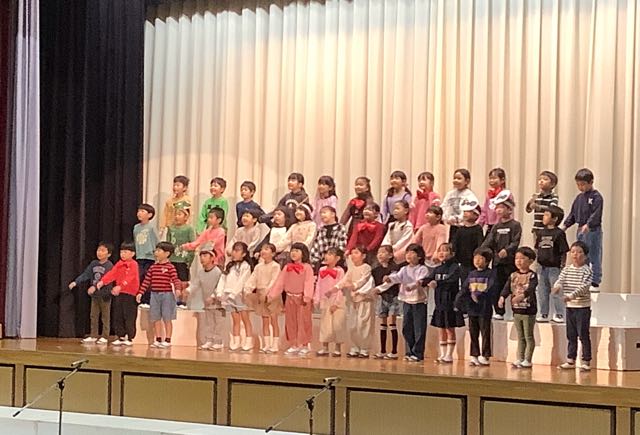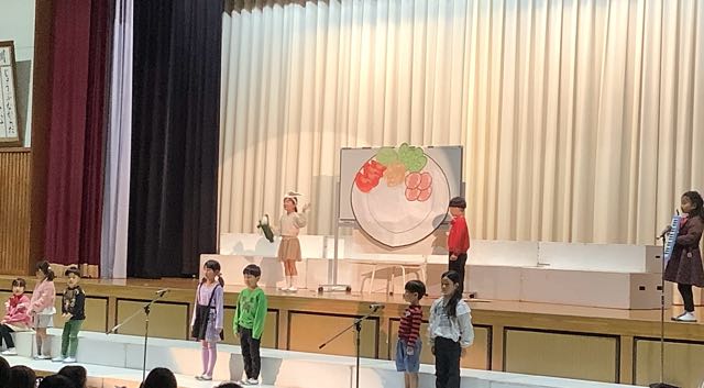 1年「サラダでげんき」。初めての学習発表会で、台詞を覚えたり、動きを覚えたりするのが大変でしたが、みんなとてもよくがんばりました。役になりきった演技や小道具、効果音など、工夫をたくさんしています。「きみイロ」の元気な歌声は、毎朝1階に響き渡っていました。今日も大変上手で元気いっぱいの歌声でした。入学から半年で大きく成長した姿をご覧いただけたと思います。