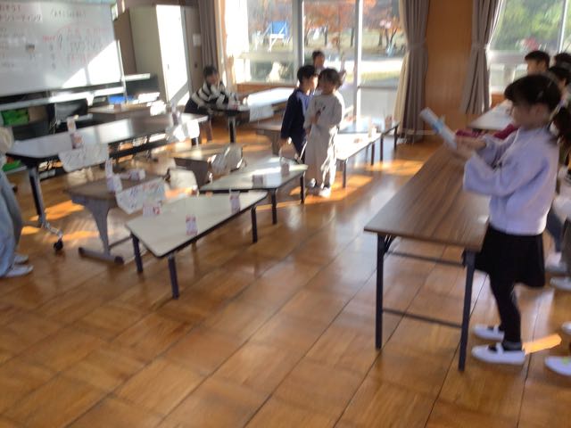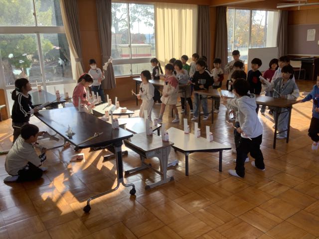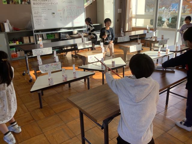 生活科の授業で「室小ロケットシューティング」という射的ゲームをしました。 紙コップを使ったロケットから改良を重ね、トイレットペーパーを使ったロケットにレベルアップしました。 そして、できたロケットを使って、約10分間で全ての的を倒すシューティングゲームをしました。近くの的から遠くの的まで、全て倒すことができました。 遊んだあとには、「このよく飛ぶロケットで、1年生に遊んでもらいたい。」という声がありました。次の授業から、1年生を招待するために必要なことを考え、準備していきます。