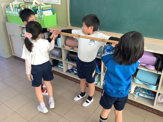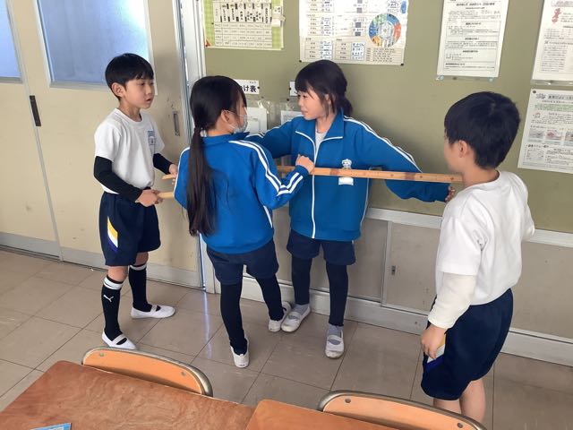 100cmをこえる長さはまだ習っていませんが、「125cmだった!」や「1m20cmだよ!」と、今までの経験をもとに測定し、教え合う姿が見られました。