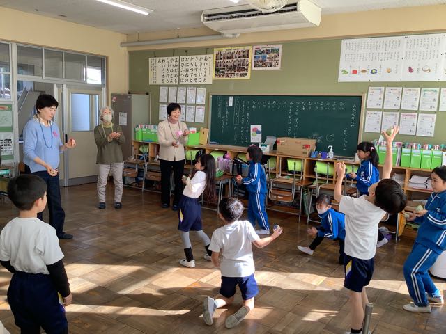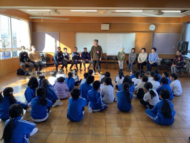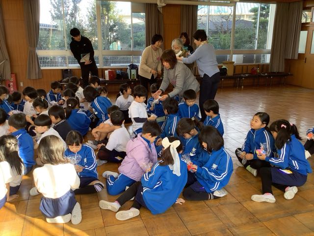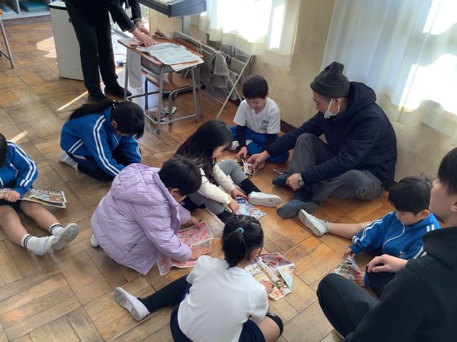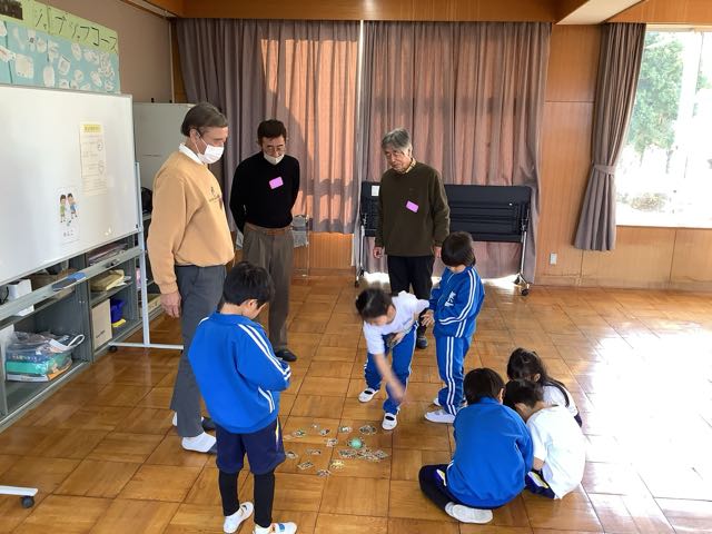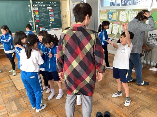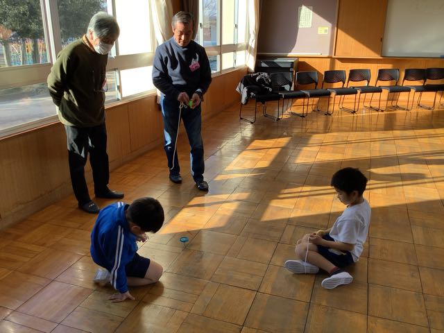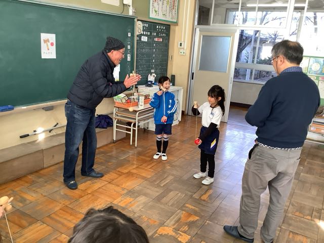 1年生が地域の方に昔の遊びを教えていただきました。めんこ、こま、けん玉、お手玉、あやとり、紙鉄砲の6種類の遊びを教えていただきました。 楽しくわかりやすく教えていただき、1年生はどんどん上手に遊べるようになりました。また、折り紙で折った手裏剣などのプレゼントもいただいて大喜びでした。