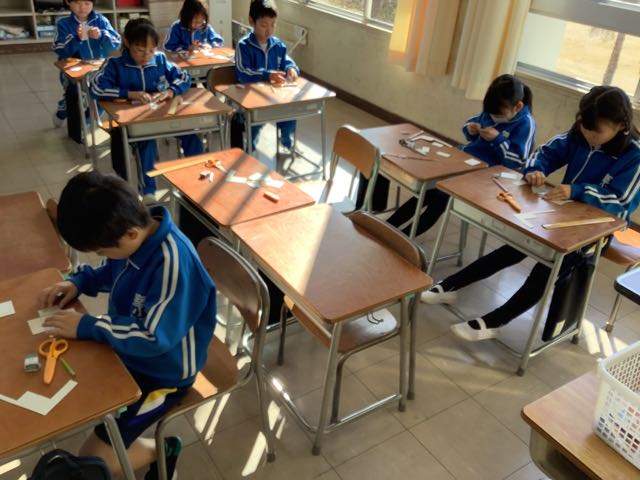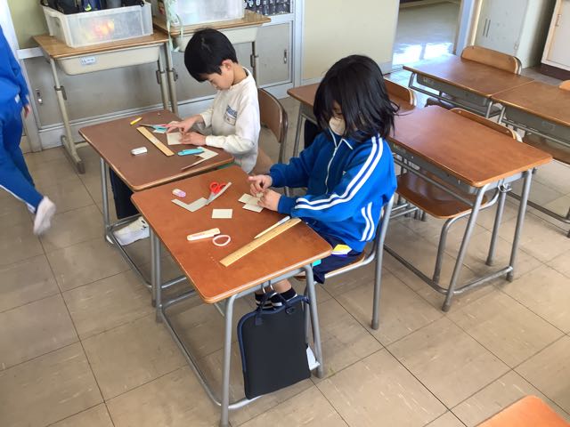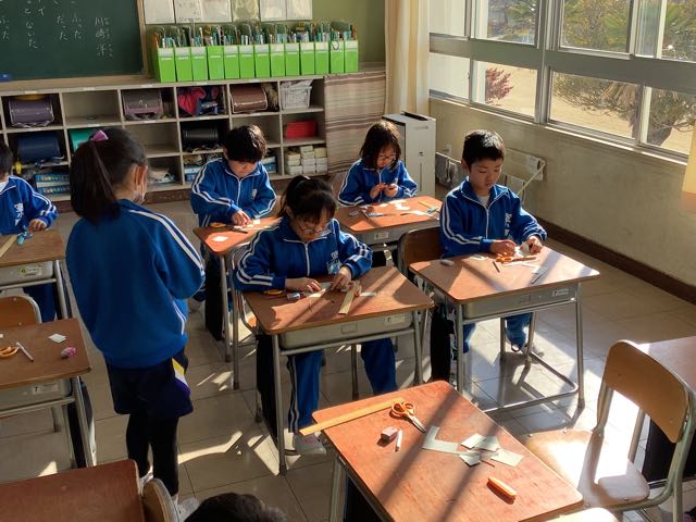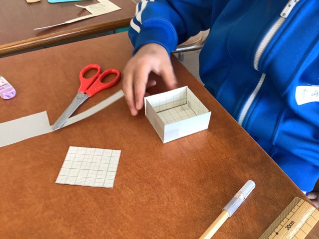 先日、算数の授業で箱作りをしました。辺はまっすぐ切り取り、角は直角にし、異なる大きさの面を2枚ずつ、6枚用意して組み立てました。余った工作用紙を使ってミニサイコロを作ろうとする子もいました。作った箱は、宝物入れやサイコロなどとして使っていきたいと話していました。